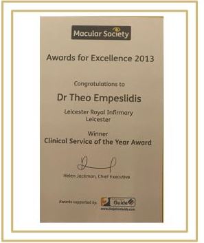 Mr. Empeslidis has been trained in Ophthalmology in Greece and the UK; and has a fellowship in Medical Retina at the Leicester Royal Infirmary. Additionally, he has undertaken further training in uveitis with Professor Murray in Birmingham. Mr. Empeslidis was the leading Consultant Ophthalmologist of the busy ARMD service at the Leicester Royal Infirmary and has been awarded the prestigious Clinical Excellence Award from the Macula Society UK in 2013.